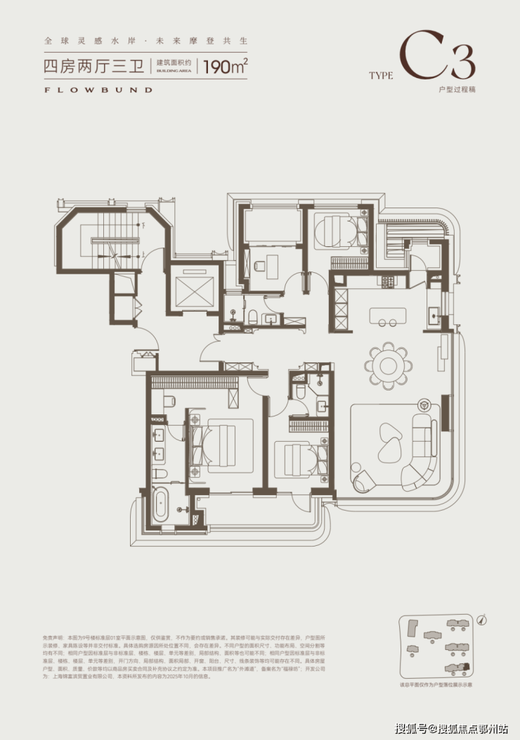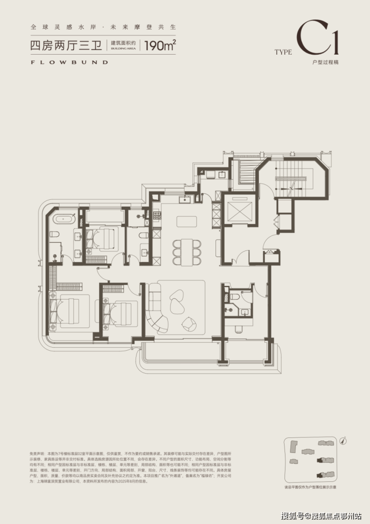 建面约195平四房为东边套,把最好的景观空间留给了餐客厅,拐角落地窗高区预计会有不错的江景视野。