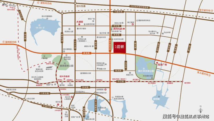 傲踞越东快速路与群贤路“十字中轴”上, 群贤路东西贯通上虞、镜湖、柯桥三区, 越东快速路畅达主城与绍兴高速口,一纵一横,执掌城市脉络。