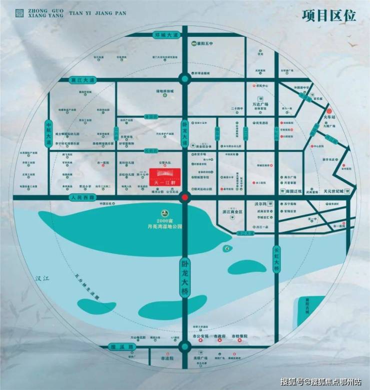 天一江畔 . 位于樊城区卧龙大道与人民路交汇处——月亮湾公园正对面。项目雄踞卧龙大桥樊城桥头堡、一线临江的城市门户地段。项目坐北朝南,南向直面汉江与月亮湾湿地公园,视野无遮挡!