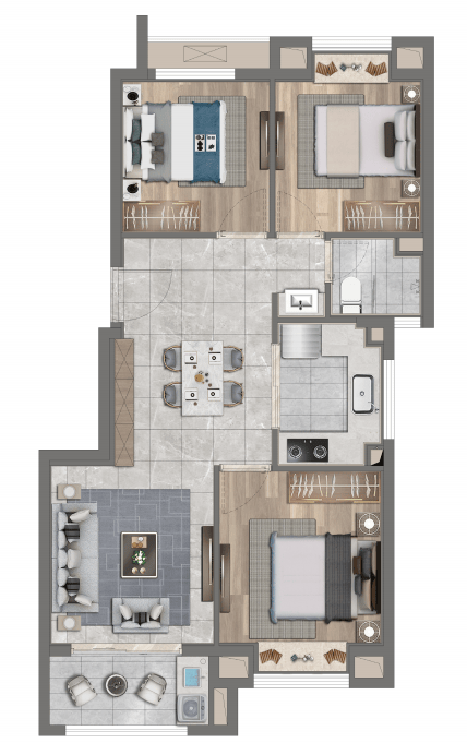 老实说,这个户型有3个卧室,很符合三口之家偏改善或者是二胎家庭的居住需求。