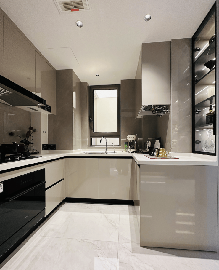 厨房空间,采用铝合金玻璃、PVC饰面的免漆门套及铝合金移门,三件套使用老板的油烟机、燃气灶、洗碗机交付,更有摩恩的水槽和龙头、定制的组合橱柜。