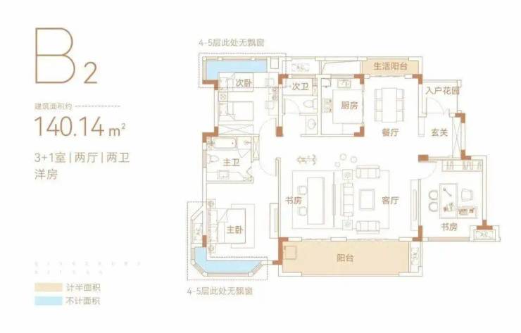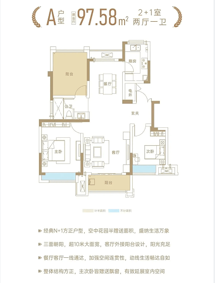 项目主推的11层洋房,户型为建面约97㎡-140㎡,均为一梯两户南北透通的纯板楼,采用经典N+1全明户型带套内花园设计,空间布局合理,得房率高达约90%。