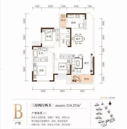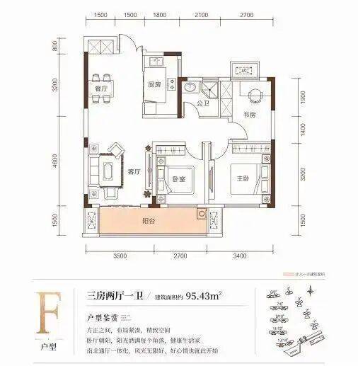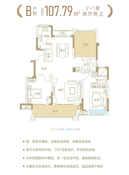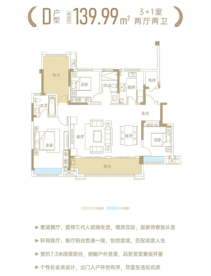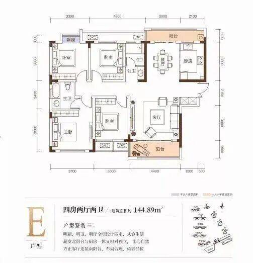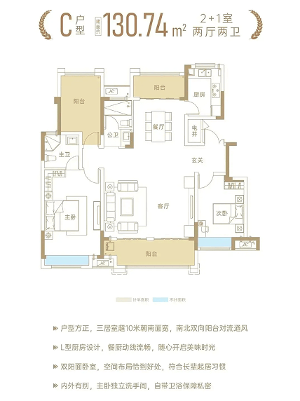 以建面约131㎡户型为例,其做到了三开间朝南+南北三阳台+主卧大套房+超级大横厅设计,无过多浪费面积,实用面积大,是洋房户型中的“优等生”,值得关注。