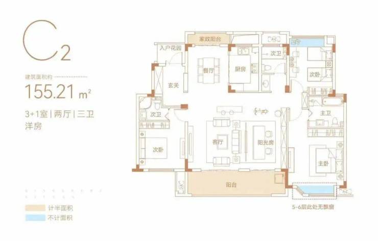 两个户型南北还带双飘窗,其中155㎡户型南向还设置双套间,三代同堂也能互不打扰。