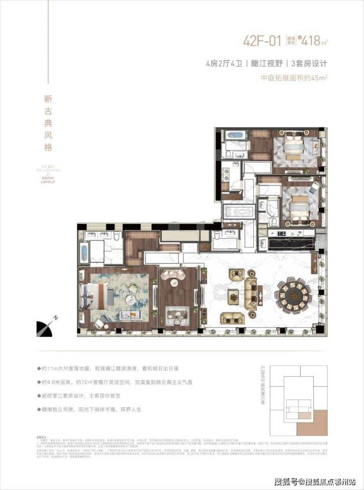 加在一起长达约38米。乘以层高,采光面积近180㎡,明媚到伤眼。 因它近70%的房源层高近4.8米;除了顶跃,户型在244—418㎡之间。再现了“高门长戟,鸣钟食鼎”的上流生活尺度。