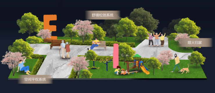 联发·时光新澍以 “全场景松弛系统” 为核心,将景观划分为 静音治愈 、 亲宠陪伴 、 自在休憩 、 街角松弛 等四大功能场域。