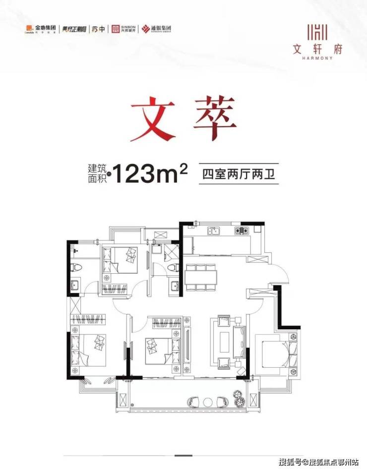 最后看建面约123㎡的户型, 无疑是高端改善买房人的优选户型。在方正、明亮、通透的基础上,做到客厅、主卧、儿童房、老人房。 四开间朝南的空间布局,让每一处空间都得以充分发挥。杜绝空间零浪费,延伸出品质生活的舒适尺度。