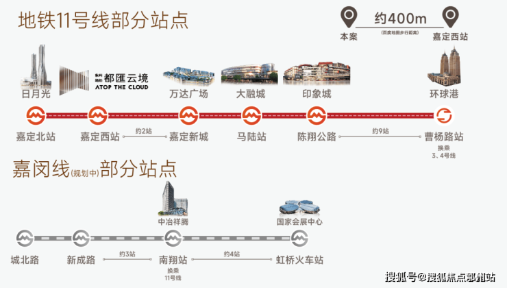 【双轨交】约400米 地铁11号线嘉定西站(百度步行距离),可于 南翔站换乘嘉闵线(在建中),从容畅达上海18+商圈