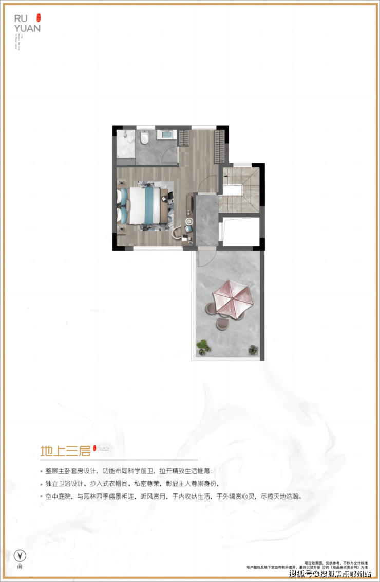 三楼整层主卧套房设计,带空中庭院。 当夏天的时候约几个朋友在庭院上喝喝茶,或者约几个朋友吃吃烧烤,喝喝啤酒,让您真正感受到人生的惬意和人与自然共呼吸的美好生活。
