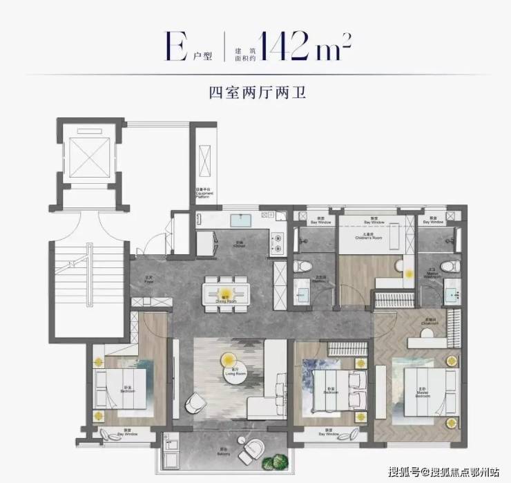 建面约103㎡的户型“三开间朝南”+“3大飘窗”的格局保证了整个户型的采光面和居住舒适度。