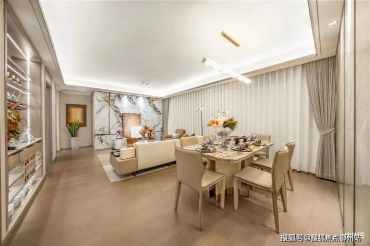 公区采用LDKB一体化设计,南向约6.5m的宽幕视野、大尺度U型厨房,去过道化设计、洄游式动线,最大程度聚集了室内公共空间,拉伸的不仅仅是尺度,更是举手投足间的优雅和从容。