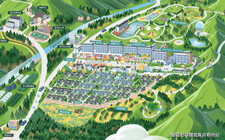 这里有高端雅致的英迪格酒店、繁华热闹的天目in66商业街、刺激冒险的自然探索乐园、充满田园野趣的耕心农场,更有独具特色的唐风合院。