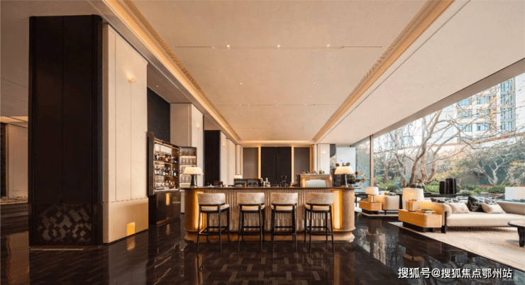 还是陈列凝固时光的琳琅艺术品,在静谧光影中叩击心灵的「游心艺廊」;融合艺术之美与镜湖春晓奢石的「灵石旋梯」;应季更迭典雅艺术花卉的「禅意花房」;吧台嵌入静湖春晓、银河流金奢石的「东方客厅」,以及吧台两端突破传统“工艺美术”框架,运用玻璃钢材质、肌理贴金箔、虹口掐丝工艺打造的「流光织梦」铜织锦艺术雕塑;巨幅玻璃移门可全部打开,尽赏庭园山水自然画卷的「四时画廊」......