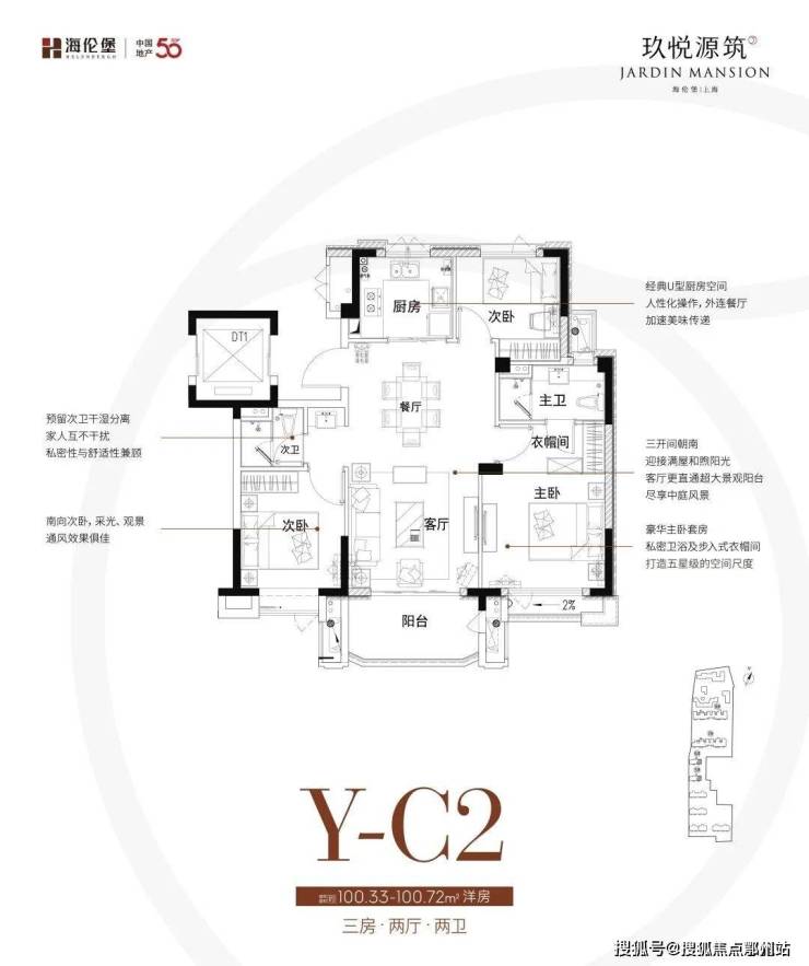 建面约100㎡的3房2卫户型,三开间朝南,主卧套房设计,几乎做到了市面上3房2卫户型能做到的所有优势。