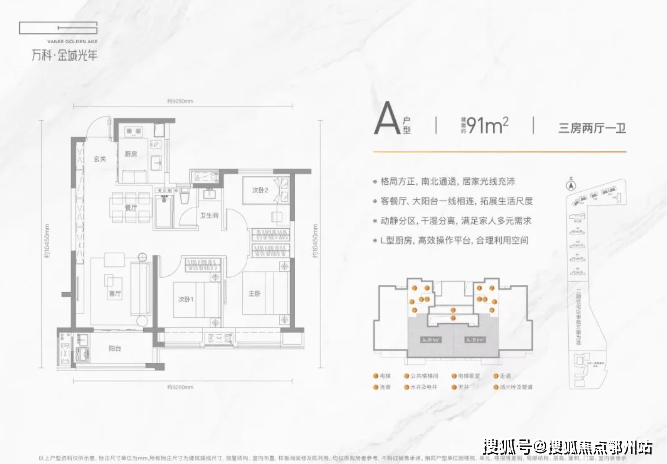 建筑面积约91-107㎡品质精装三房,格局紧凑,南北通透,可满足家庭三代同堂的居住需求。
