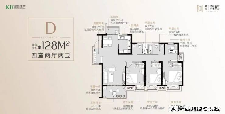 ④ 建面约128㎡,四室两厅两卫。更多的房间,满足更多的家庭成员生活需求。户型 四面朝南采光,让整个房子全明通透; 超大尺度客厅是家庭聚会的好地方, 套房式主卧,尊崇性与私密性兼得。