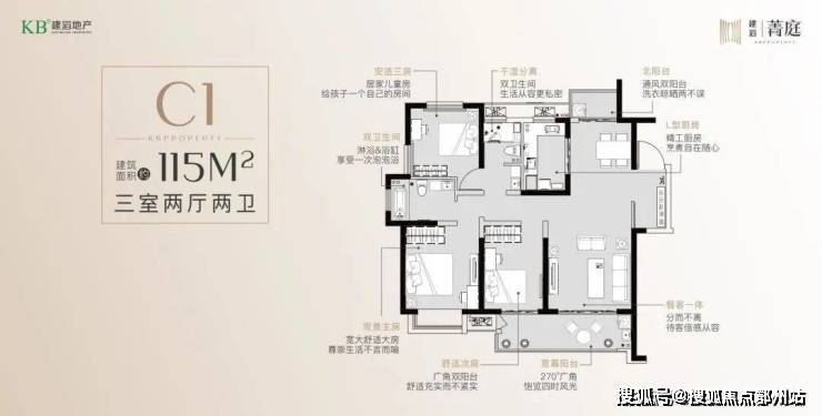 ③ 建面约115㎡,三室两厅两卫。户型面积更加宽敞,房间品质也再升一级。 双阳台、大三室、三面采光,尺度尽显; 双卫生间也让生活更加方便。