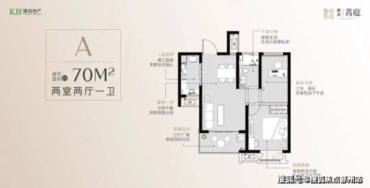 ① 建面约70㎡,两室两厅一卫。刚需置业的爆款之选,空间利用十分高效,性价比高。 餐客厅一体化、南向观景飘窗卧室、270°观景阳台,都让空间显得更加开阔明亮; 干湿分离卫生间、L型厨房,区域功能划分明确。