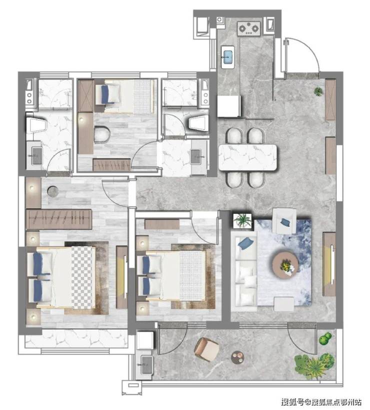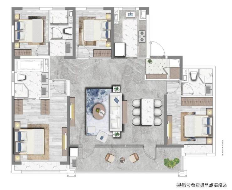 户型点评:同样是4房3卫的设计,做了餐厅+客厅的横厅设计。双卧室套房,私密性比较高。主卧设计了步入式衣帽间。
