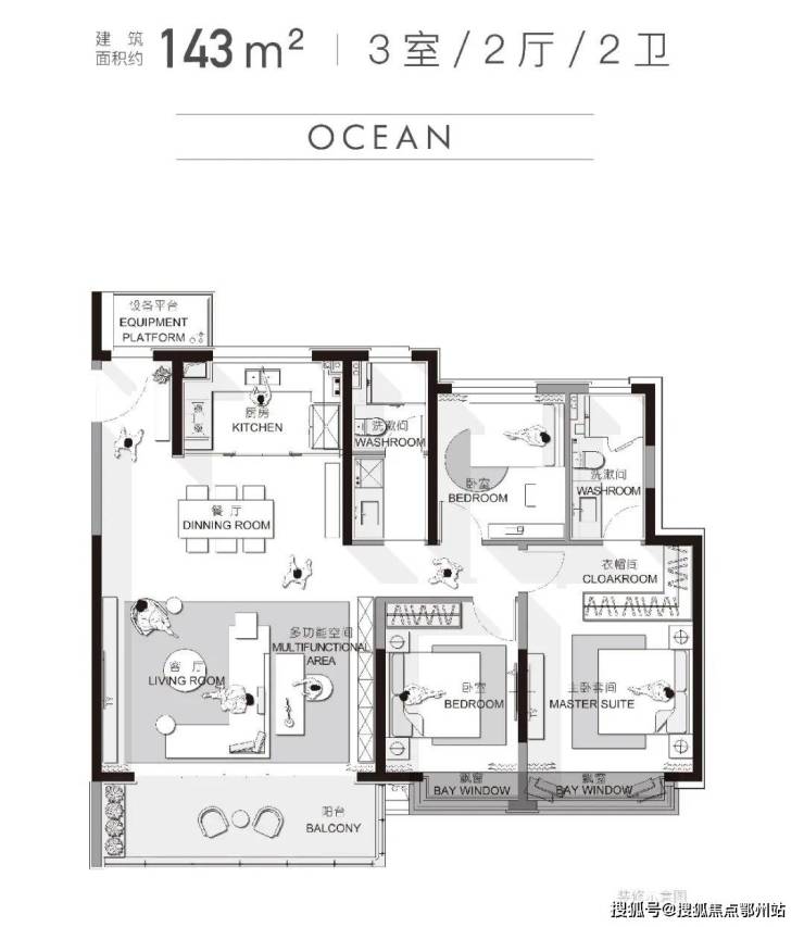 建面约143㎡三房两厅两卫:客餐一体化设计,打造出巨幕剧场式家庭大公区,空间感和奢适感拉满!