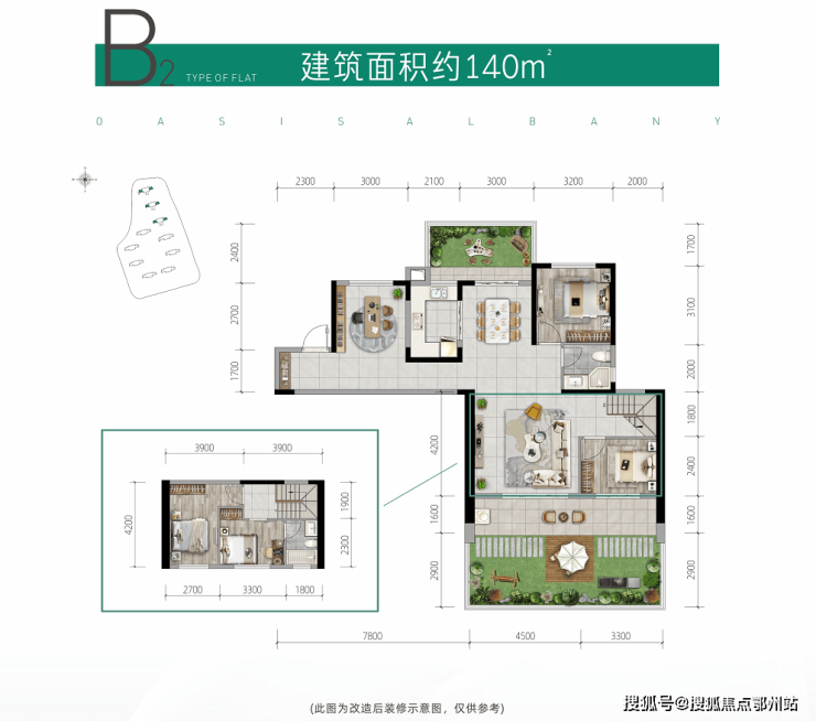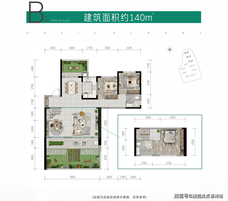 建面约140㎡:一楼南北双向绿化阳台,南向庭院巨大,大横厅设计,也可实现3间次卧格局。