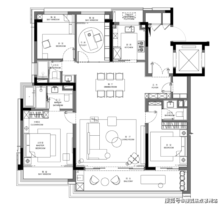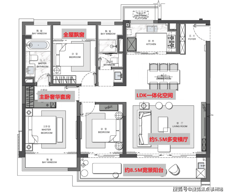 主卧豪华 套房+独立衣帽间+浴缸+270°转角飘窗,极致生活享受
