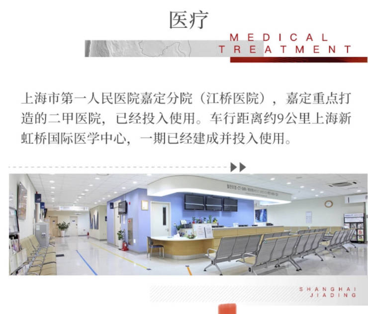 医疗:距本案1.5公里【上海市第一人民医院嘉定分院(江桥医院)】,嘉定政府重点打造的二甲医院,已经投入使用。车行距离约9公里上海新虹桥国际医学中心,一期已经建成并投入使用。