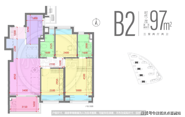 97B2户型,三房两厅两卫,得房率约76-77%(仅供参考)。户型结构就像放大版的89户型,多了一个洗手间。