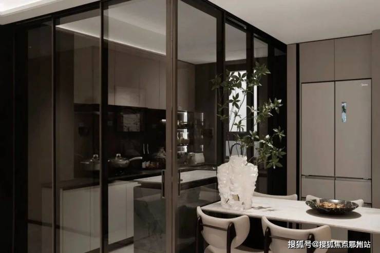 隐藏式厨房设计,功能分区明确,实用又便捷。国产一线高级定制(志邦)的橱柜,典雅精奢,所有拉手的角全部做了圆角处理,贴心又人性化。