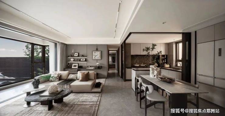 超过5m的南向宽景阳台,全景落地窗的搭配,观景视野开阔!值得一提的是,从客厅到阳台,地面都是通铺的仿石砖大规格柔光砖,真正实现空间一 体化。