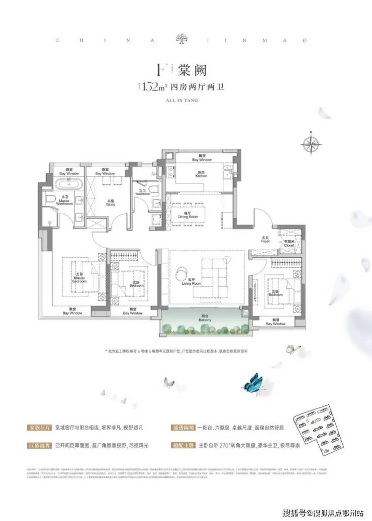 建面约137、152㎡4房2厅2卫,空间布局非常相似,都做到了 四开间朝南+入户玄关+6飘窗+主卧套房设计 ,所有空间的尺度一步到位。