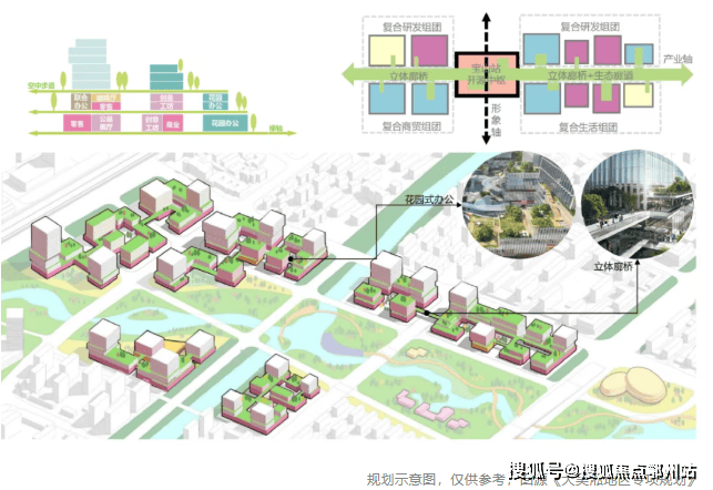 立体街区衔接高铁站的城市平台层,构建由立体廊桥串联的研发街坊,结合屋顶花园,塑造景城相融、便捷高效的花园式办公。(信息来源《大吴淞地区专项规划》)