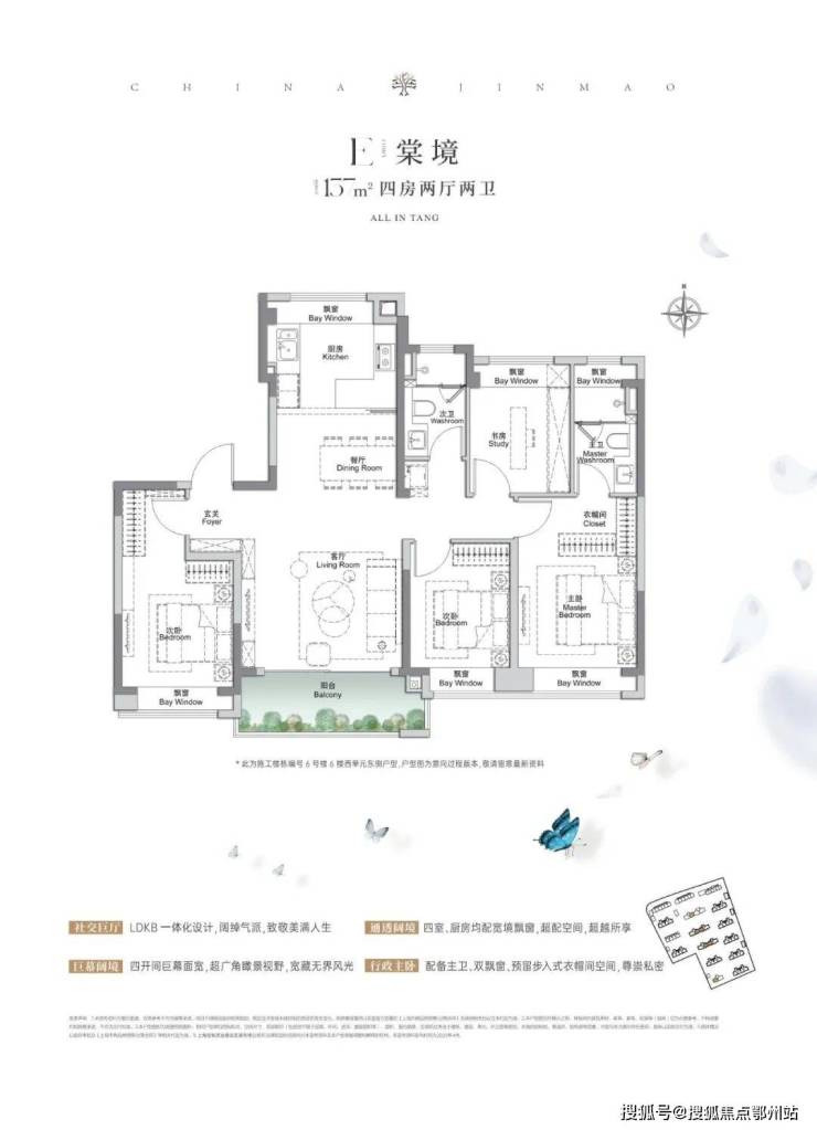 建面约117㎡3房2厅2卫,做到了 3开间朝南+5个飘窗+主卧套房设计+270°转角飘窗 ,居住体验、舒适度、尺度感倍增。