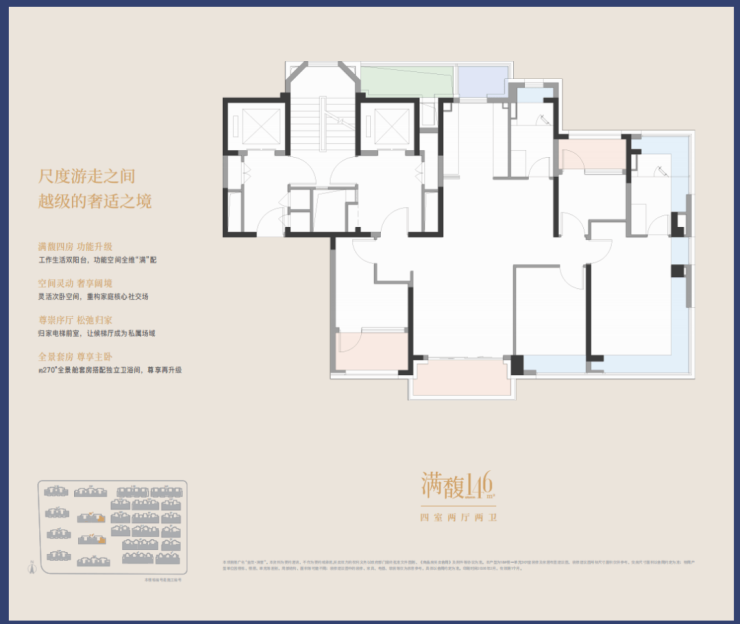 四房功能性够强,且主卧为 270°全景舱套房,配备独立卫浴间,舒适度与私密性双爆表!