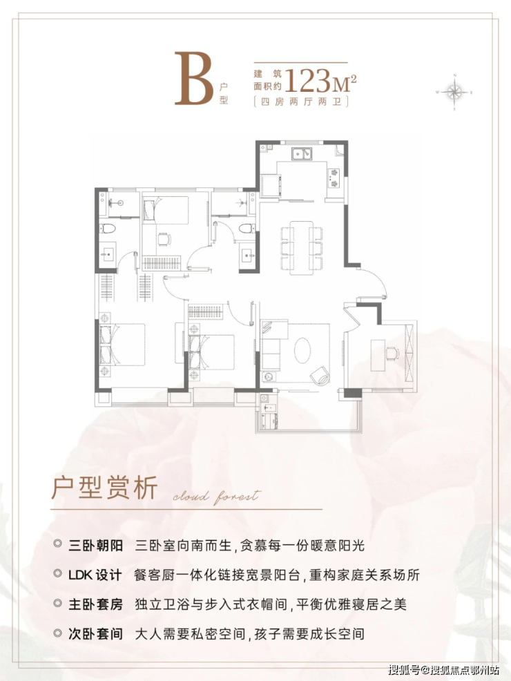 在当下100㎡及以下面积段占绝大多数的情况下,建面约123㎡4房本就十分稀缺。而在产品设计上更加符合全龄段各种家庭结构的居住需求。