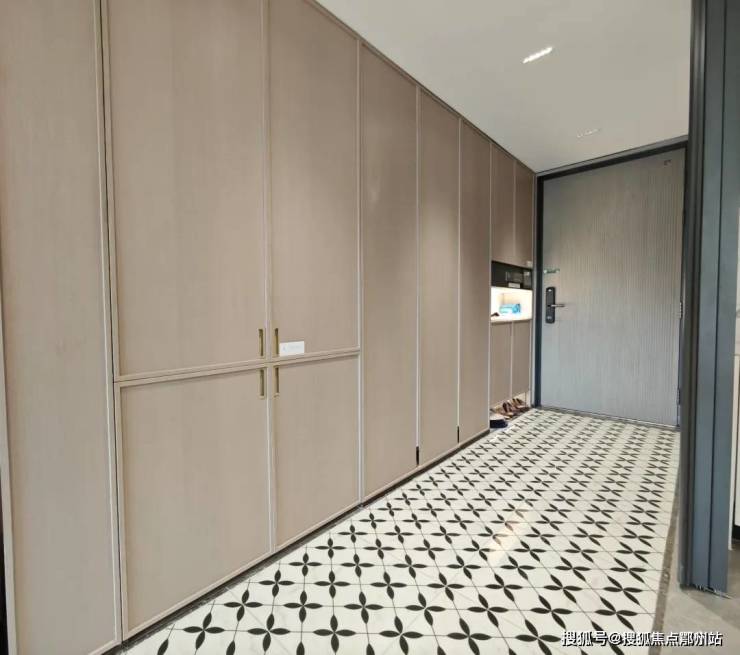 第三,项目入户是S墙的设计,为了让小户型也能容纳双开门的大冰箱。并且为了未来居住后的视觉体验的统一性,直接把冰箱做在了装标内。这在上海也是十分少见的。