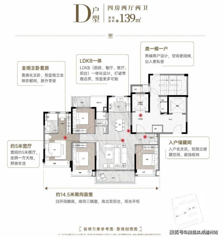 160㎡户型,1T1户设计, 高配臻质四房+双套房,星级酒店级体验皆是日常; LDKB一体化设计,南向约15米四开间大面宽,