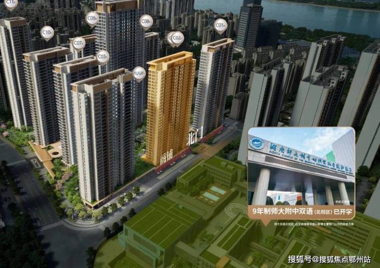 C02# 栋央景楼座南向约58米超阔楼间距,正望“庭影书意”景观组团,俯瞰水景、廊架、阳光草坪;北向与师大双语学校北校区仅一街之隔,俯揽校园风光,高楼层超200米视野,让操场上孩子奔跑雀跃的身影,成为家中风景。(师大附中双语北校区,招生政策等信息以教育主管部门信息为准;距离来源高德测距,以实际为准)