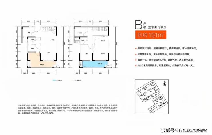 🔘103㎡复式(4房2厅2卫)开福北稀缺复式,唯一在售产品,二手房升值潜力无限;5.9米层高,生活上下层分区;媲美140平米户型,得房率约110%;南向面宽6.5米,3房变4房,3开间朝南;6.5米面宽*2的双景观阳台,无敌采光,景观舒适度加倍;