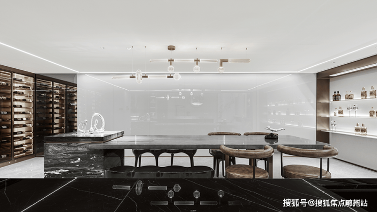 穿过岛台 另一侧是品酒室,大面积玻璃与石材细腻的纹路相结合,在起承转合间能够捕捉到,彼此细腻的纹理与形态,