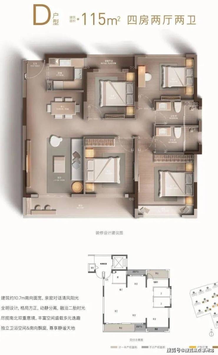 建筑面积约110㎡均为边套户型,纵享丰富观景视野,四房两厅两卫设计并蓄尺度感与尊崇感。