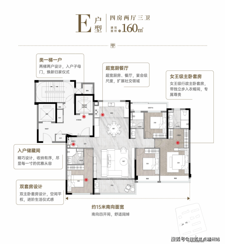 160㎡户型,1T1户设计, 高配臻质四房+双套房,星级酒店级体验皆是日常; LDKB一体化设计,南向约15米四开间大面宽,