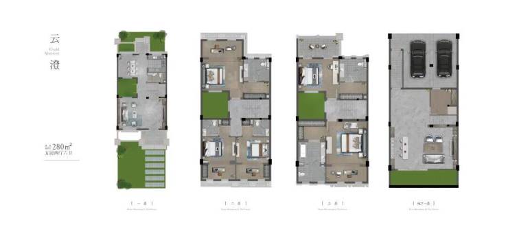 约280㎡户型 :经典四联排格局,功能分区明晰,南向庭院与多个阳台、露台相连,实现室内外生活的自然交融。