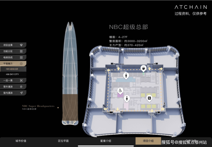 建筑面积:25.3万平方米,含24万㎡超甲级写字楼(1-60层)与1.3万㎡丽思卡尔顿酒店(61-80层)