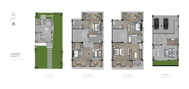 约355㎡户型 :多为双联排或端头位置,享有更大的面宽与庭院面积。尊崇的主卧套房体系、奢华的社交厅堂、以及丰富的纵向拓展空间,共同定义顶级世家大宅的格局。