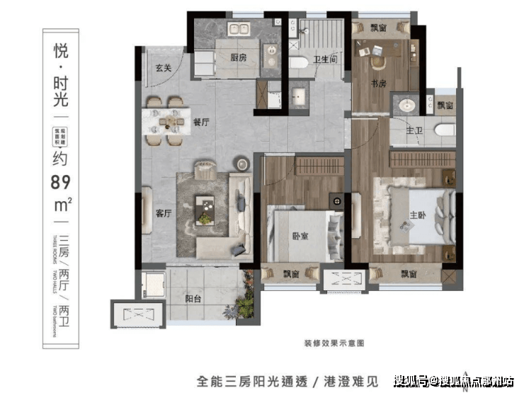 三开间朝南 、户型十分方正, 三个房间都有飘窗 ,拓展了室内的空间; 餐客一体、大开间 的设计,小户型做出了豪宅感,两个卫生间设计,是市面上难得一见的 功能性小三房 。这款小户型总价低至79万,刚需可入手!