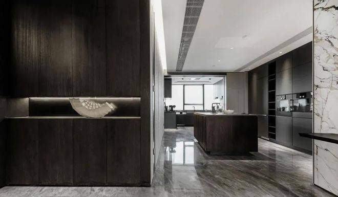 约440㎡“宝格丽”东边套,则化身黑与白的经典碰撞。喜马拉雅灰大理石和拉丝橡木饰面的丝丝入扣,诠释了不同材质的平衡之美。不论精装品牌或用材工艺,项目极尽高配之能事,装标达惊人的约15000元/㎡。