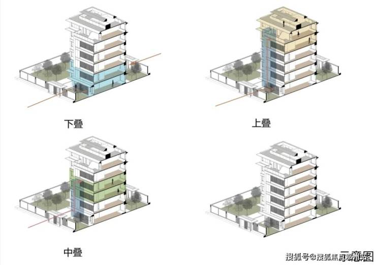 下叠:南北入户;中叠:北花园入户;上叠:单元门厅入户。