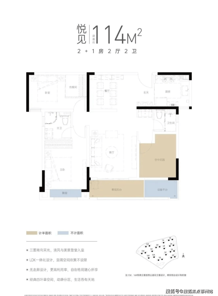 ·建面约114㎡2+1房,三开间朝南,充分考虑家庭成长与均好需求,主次卧开间皆超3米,客餐厅等面宽,营造约30㎡餐客一体空间,各功能区尺度均衡,南向景观阳台开间约6.8米(含设备平台),实现小户型大空间