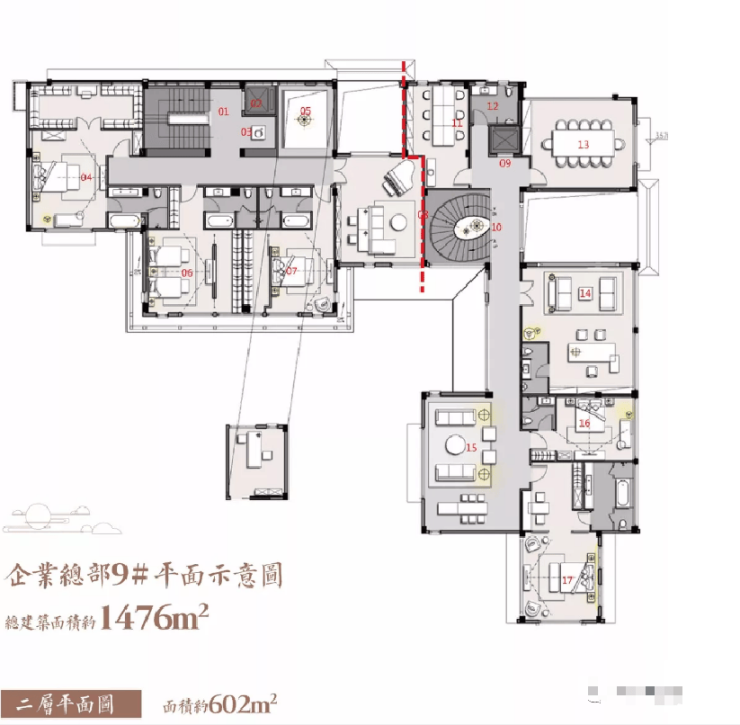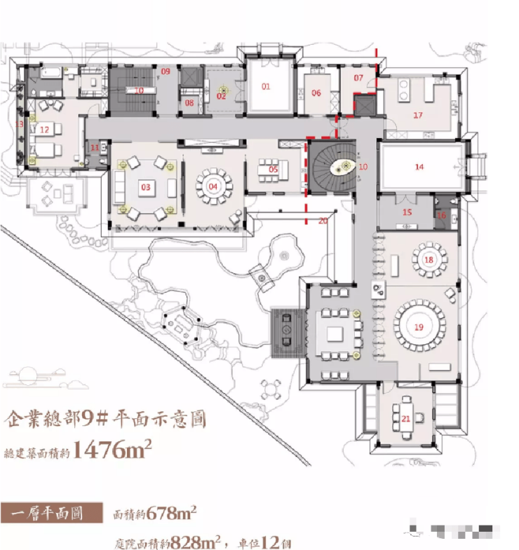 在售户型: 1200㎡——1400㎡之间,另外将附赠庭院约600㎡-1000㎡,地下一层、及夹层空间约1000-1200㎡。